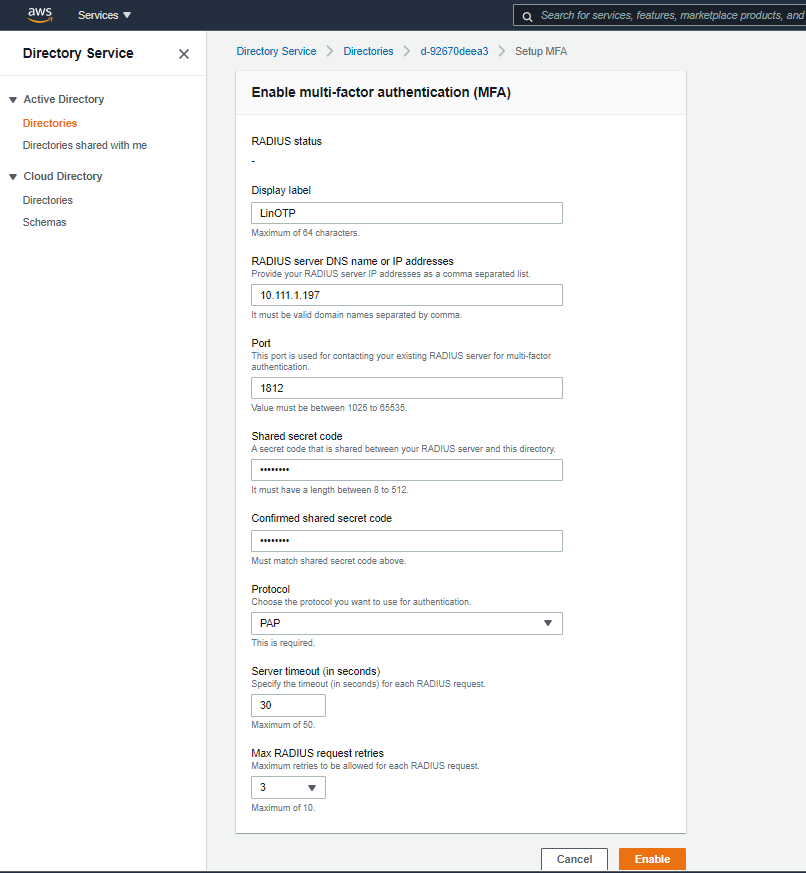 - Shared secret code : EC2의 /etc/raddb/client.conf 에서 설정한 secret 값