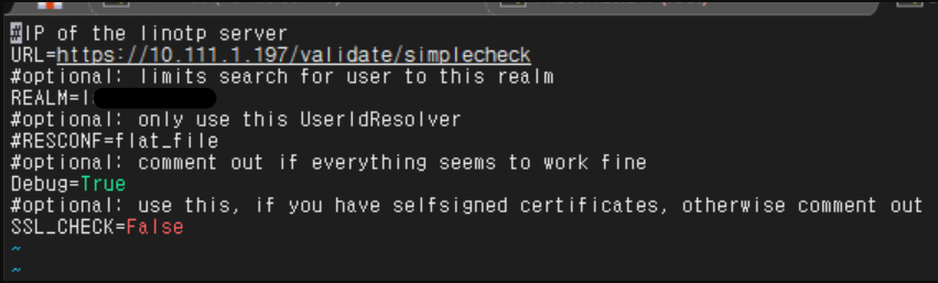 vi /etc/linotp2/rlm_perl.ini#IP of the linotp server URL=https://localhost/validate/simplecheck #optional: limits search for user to this realm REALM=[YOUR-REALM] #<--- 2단계-7. 에서 만든 REALM 입력 #optional: only use this UserIdResolver #RESCONF=flat_file #optional: comment out if everything seems to work fine Debug=True #optional: use this, if you have selfsigned certificates, otherwise comment out SSL_CHECK=False